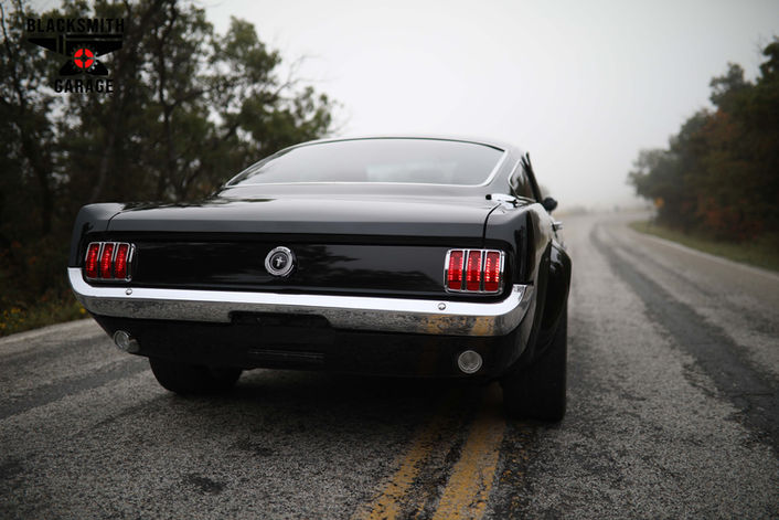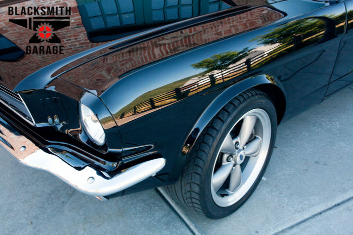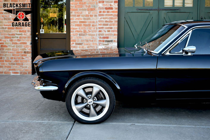 Rear suspension is an un-modified solid axle three link from a 2005-2014 S197 code Mustang which is wider than the original 1965 resulting in the increased track and stance of the car and includes modern disc brakes and ABS.